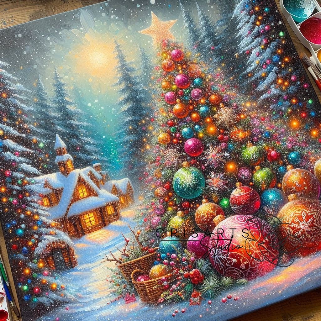 - Quadros temáticos com paisagens nevadas, árvores iluminadas ou presépios estilizados.